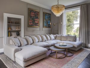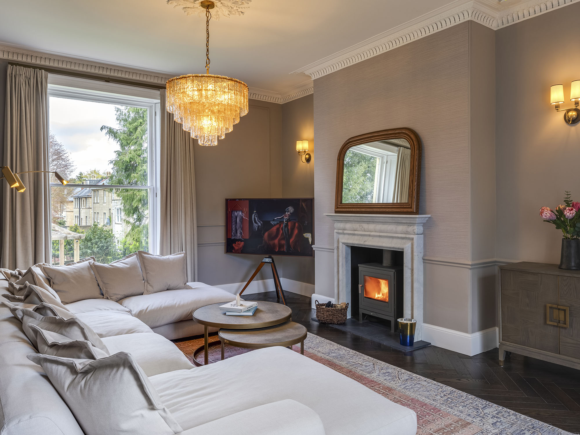 The main drawing room features triple-aspect sash windows, a large bay window and several seating areas arranged for conversation or quiet reading. Decorated with Soho Home furnishings and original artwork, it includes a bar area, underfloor heating, a log-burning stove (with wood provided), and a Bluetooth sound system.