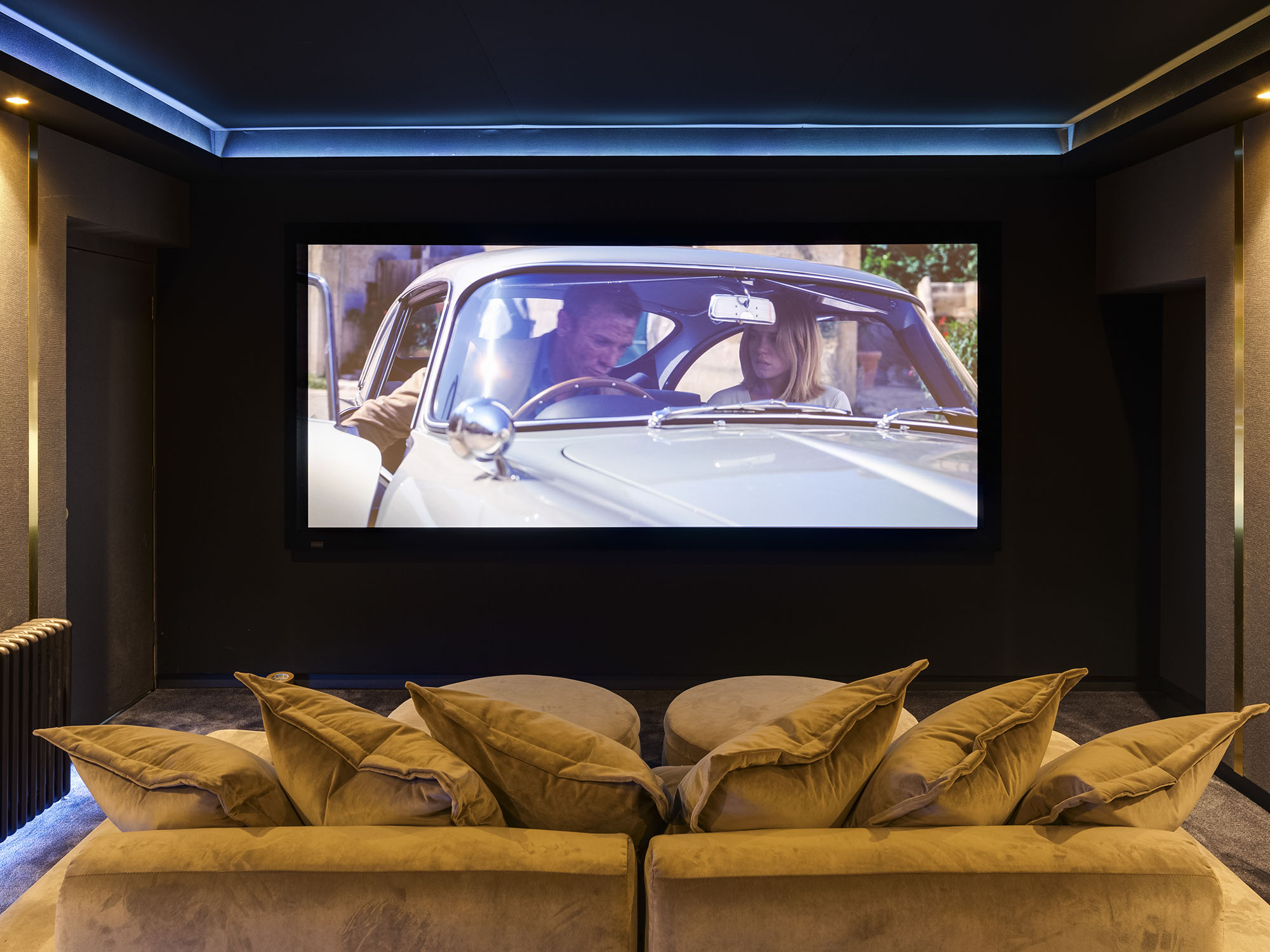 - Cinema room with 4K 120″ screen, 13 speakers and movie library