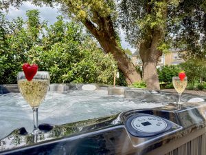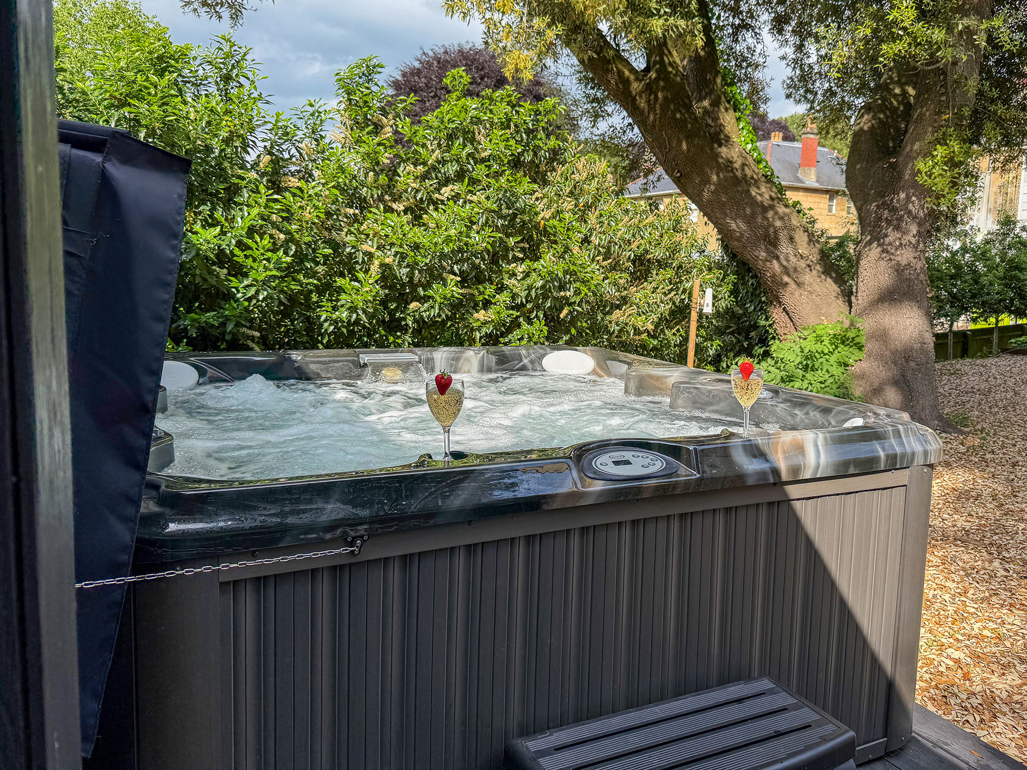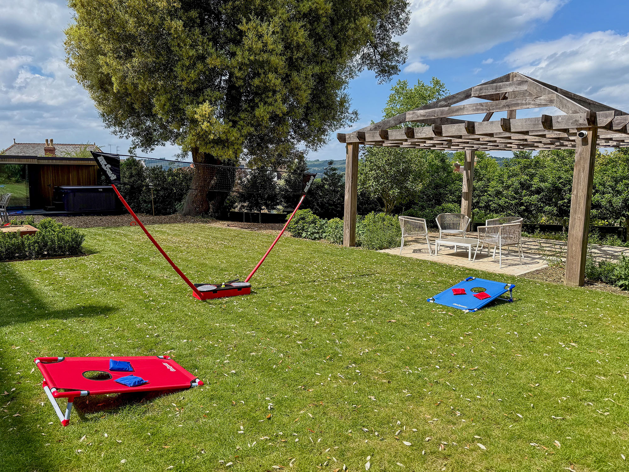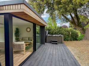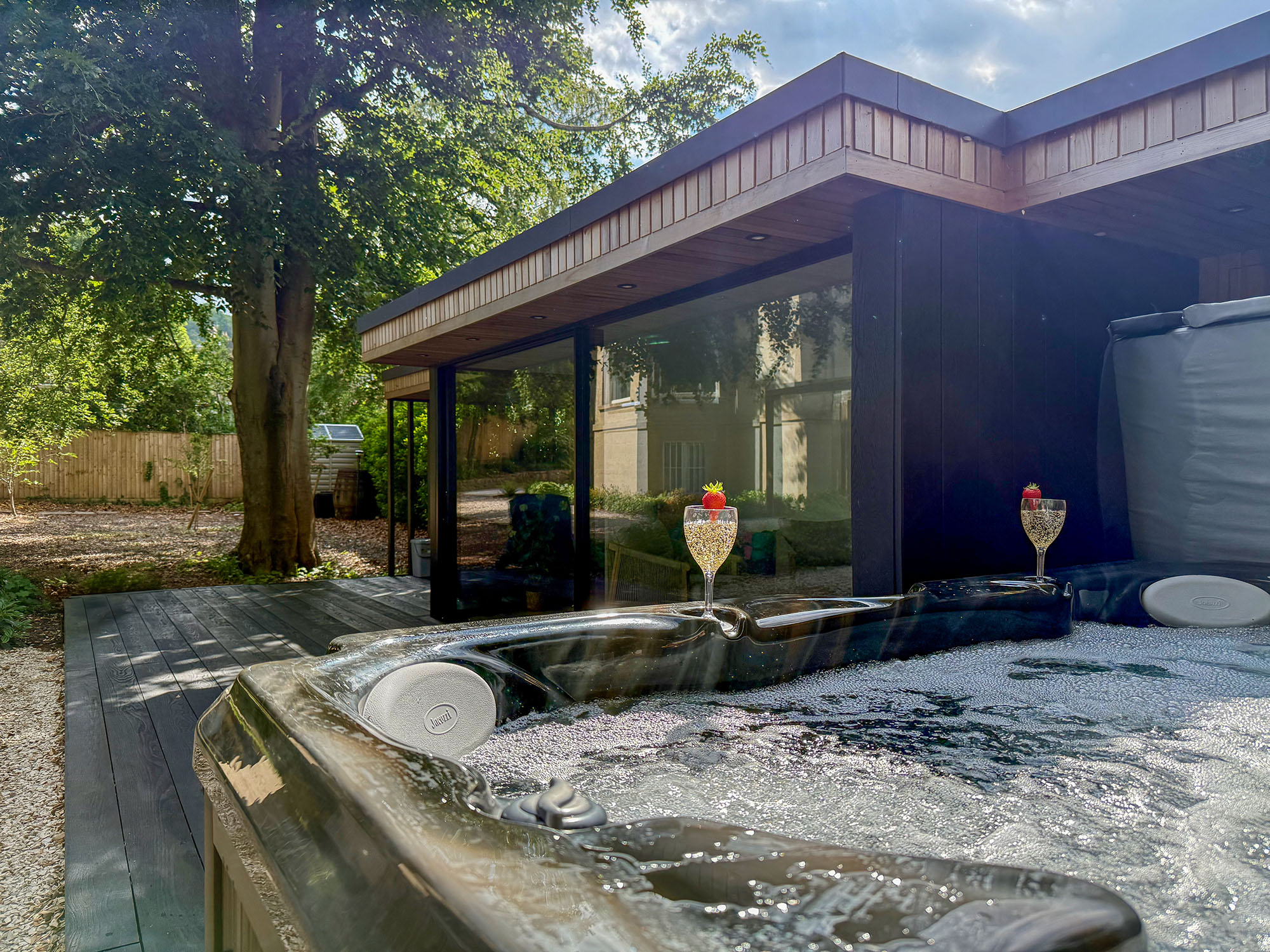 A hot tub for eight sits beside a small changing room, while the garden room offers sheltered seating if the weather turns.